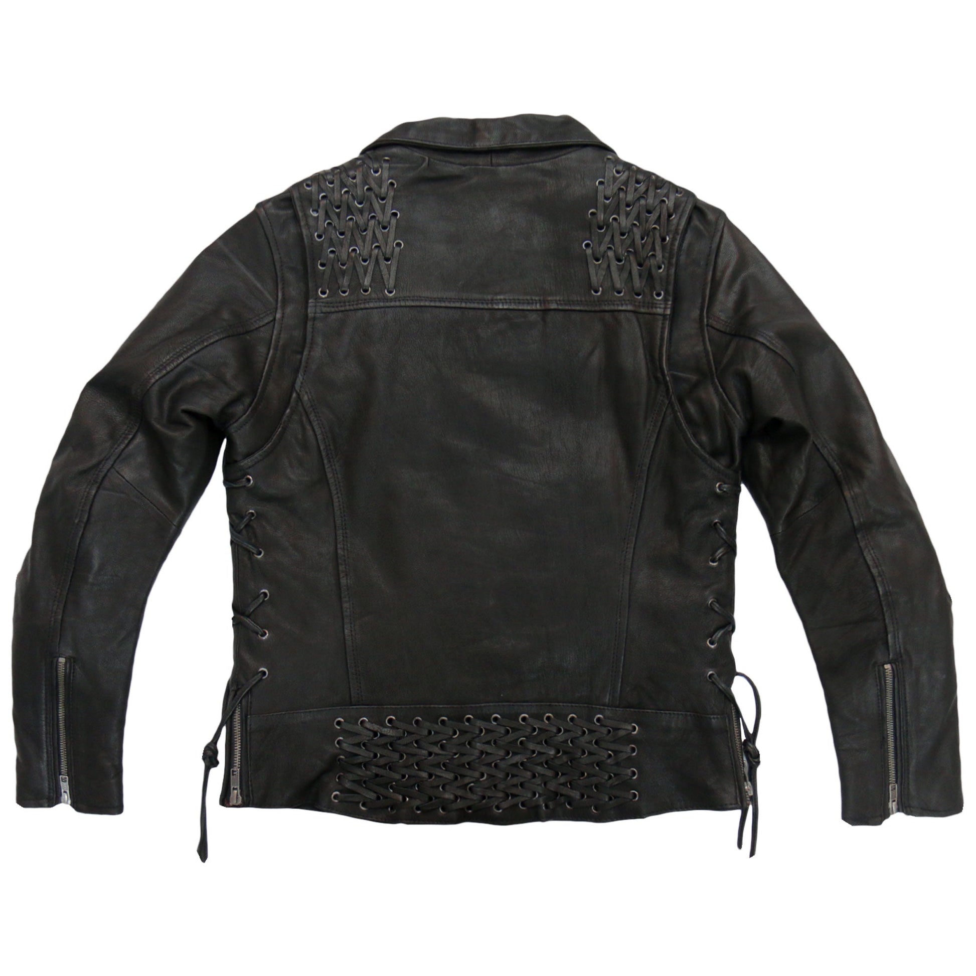 Get ready to meet your favorite new leather riding jacket. This Hot Leathers motorcycle jacket is built using super soft medium weight cowhide & features antique silver YKK zippers and snaps. The jacket also comes with front sleeve and back vents; a great feature when you need that quick cool down while riding. This leather jacket has great rawhide lace detail on the shoulders, upper and lower back. It also features two front zipper pockets, a fold down snap collar, two carry conceal inside pockets, lace up sides & a zip out quilted lining.