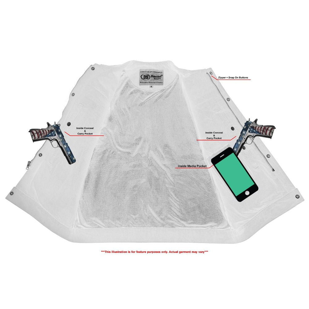 2 upgraded style concealed gun pockets between the snap and the zipper made of special heavy-duty textile with built-in holsters and snap closure.