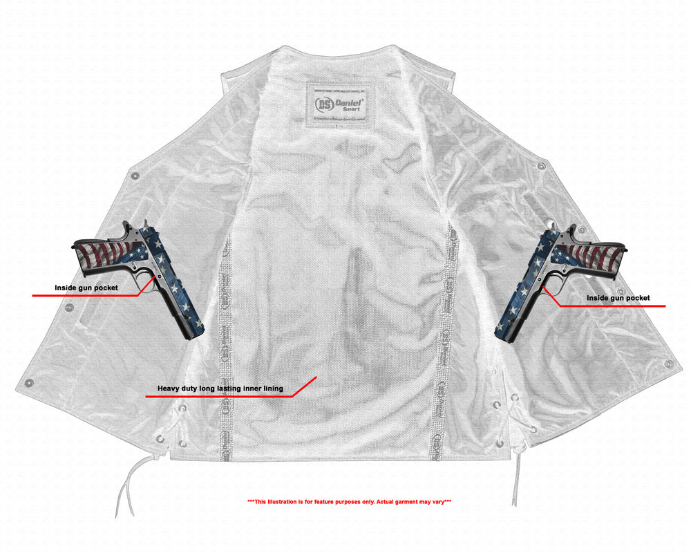 2 inside concealed gun pockets made of special heavy-duty textile with built-in holsters and snap closure.