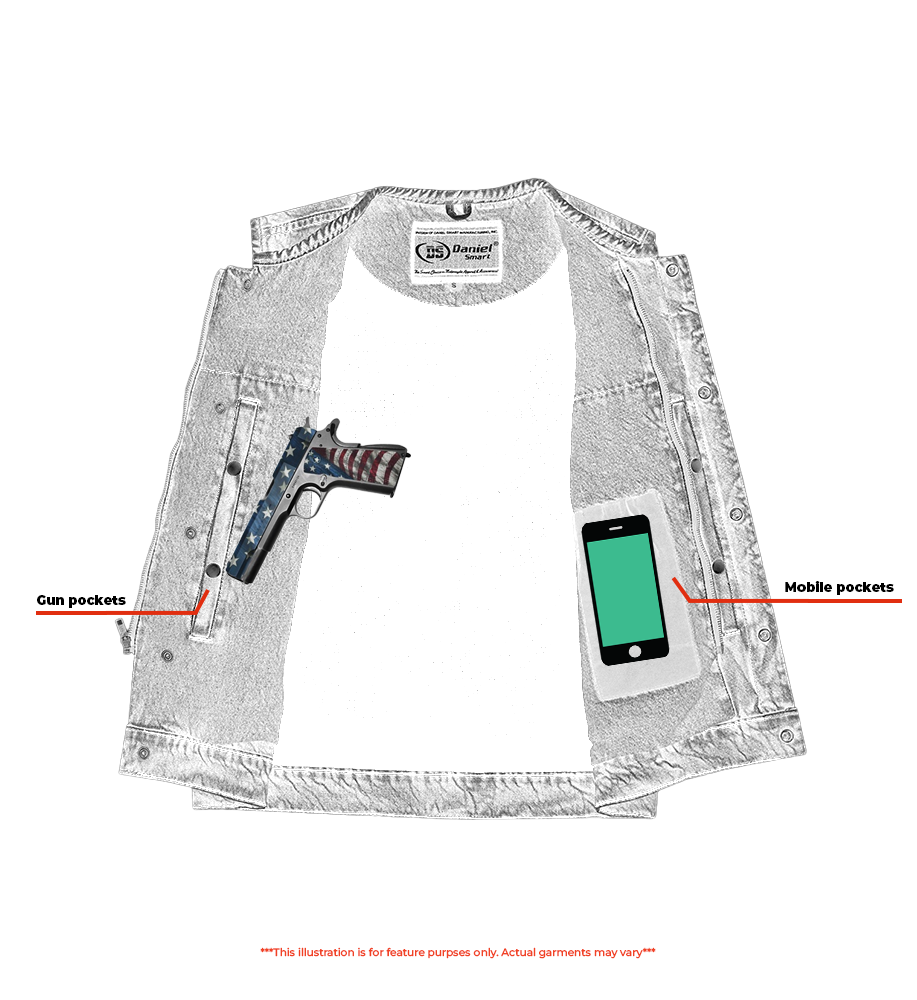 2 upgraded style concealed gun pockets between the snap and the zipper made of special heavy-duty textile with built-in holsters and snap closure.