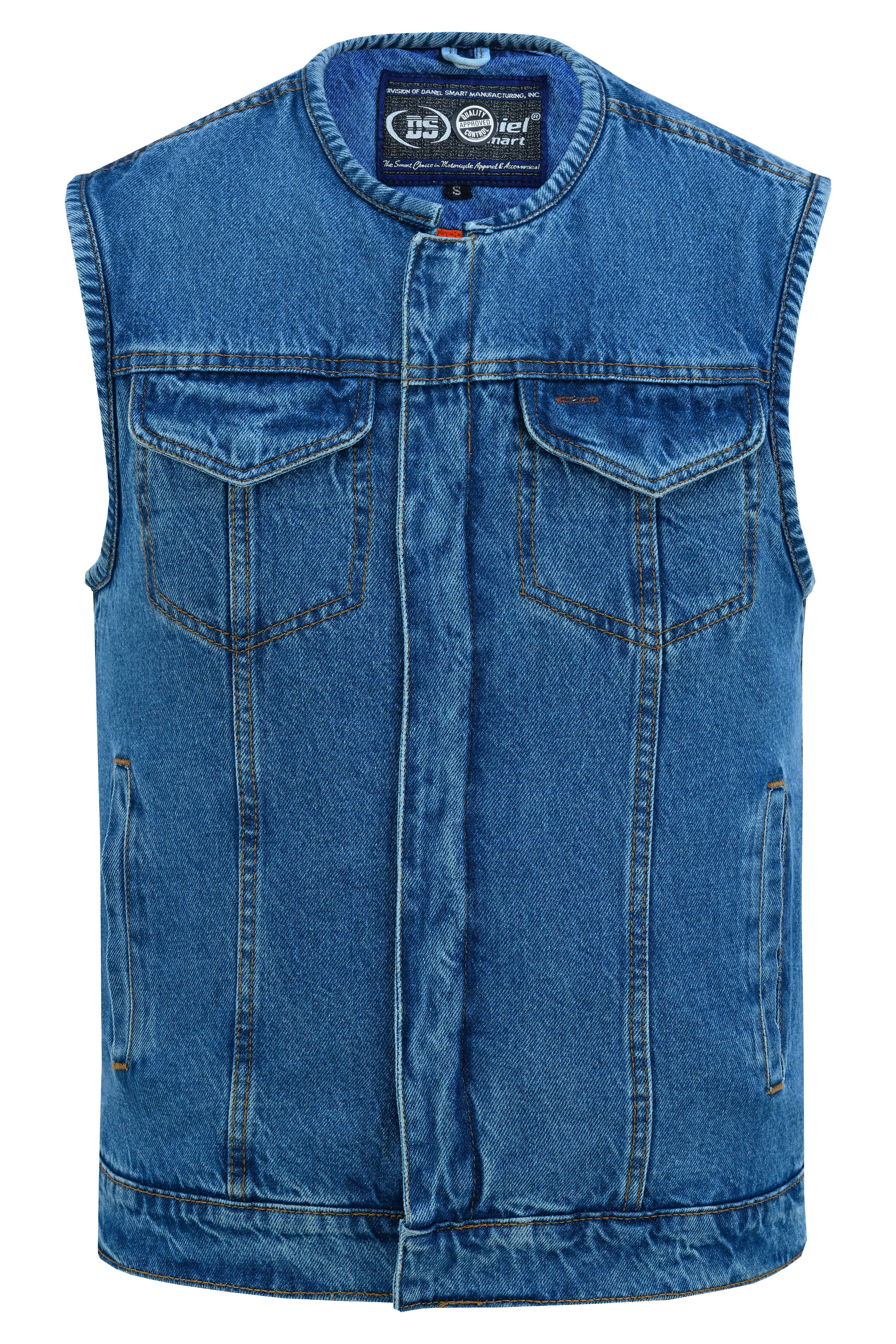 Mens Blue Denim Motorcycle Vest with Concealed Snaps & Zipper